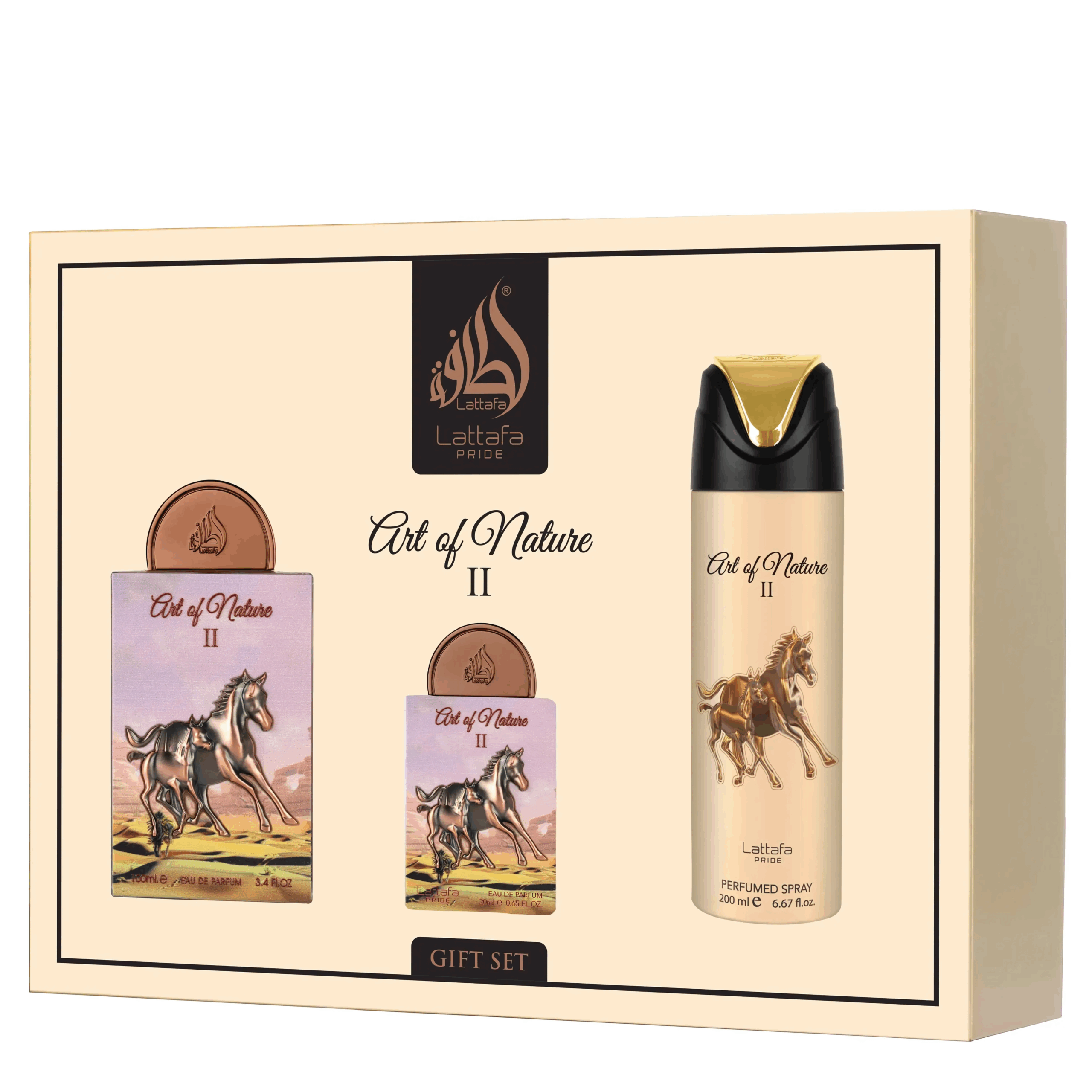 The Art of Nature II Gift Set by Lattafa Pride is a woody-floral work of art in Arabian fragrance that captures the essence of exquisite luxury. It is made for people who appreciate timeless elegance. This scent wraps you in an air of luxury and originality that goes well with both modern elegance and vintage charm. This smell journey is perfect for giving as a present or treating yourself. It combines traditional and modern art to provide a scent that will stay with you.